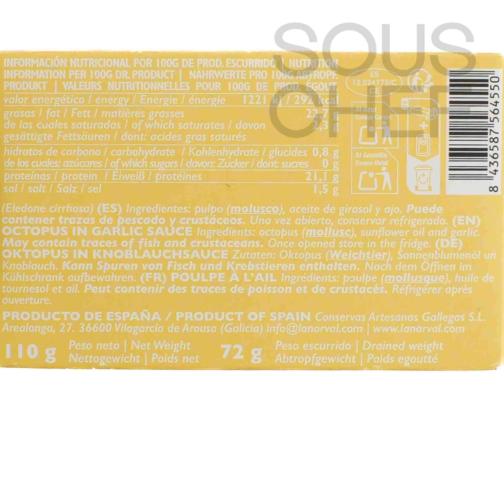 Product formulations and details may change. For the latest ingredients and allergen information always check product packaging prior to consumption. Ingredients: Octopus (mollusc), sunflower oil, garlic. May contain traces of fish and crustaceans)Â