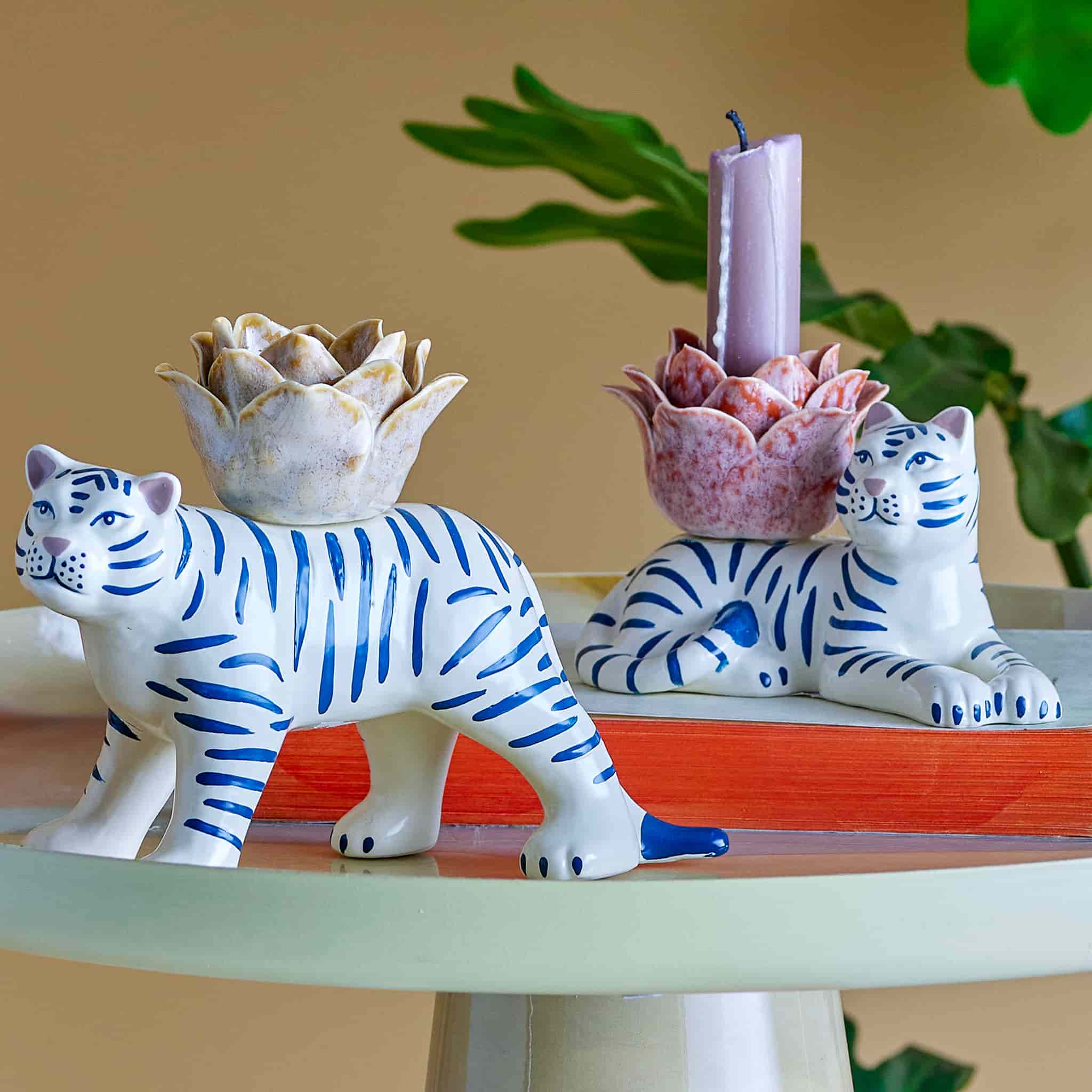 Brighten up a room with this set of tiger candle holders. They’re made from glazed stoneware with flower-shaped sockets on top. Add a colourful candle to create a cosy ambience at home.