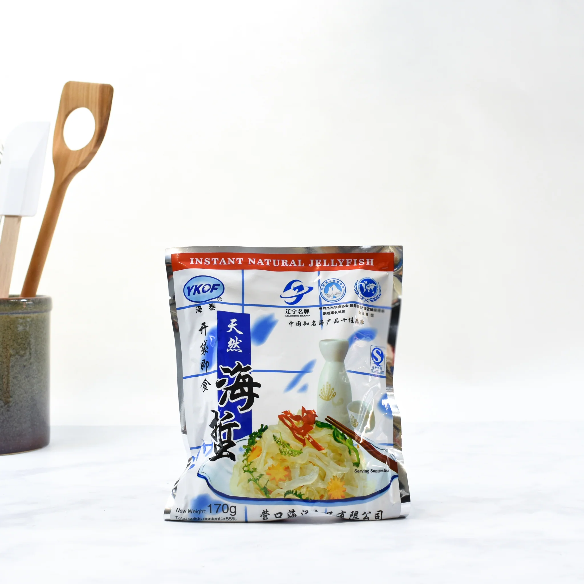 Shredded jellyfish is a popular Chinese starter or snack. Jellyfish has a highly prized texture, but very little flavour - this instant shredded jellyfish it is perked up by a sachet of a tangy dressing, and is excellent served with shredded cucumber and poached chicken. To serve, rinse the shredded jellyfish in cold water before mixing it with some shredded cucumber and the dressing.
