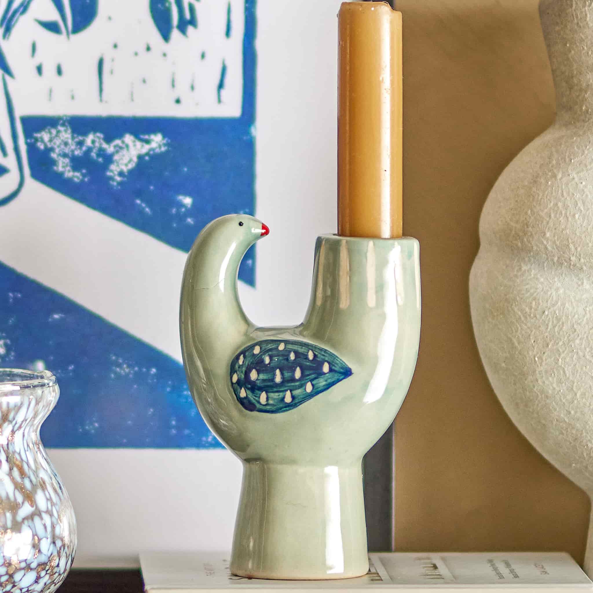 Illuminate your home with the Trudy blue bird candle holder. It’s made from stoneware and finished with a shiny glaze. The playful bird design will delight any animal lover.