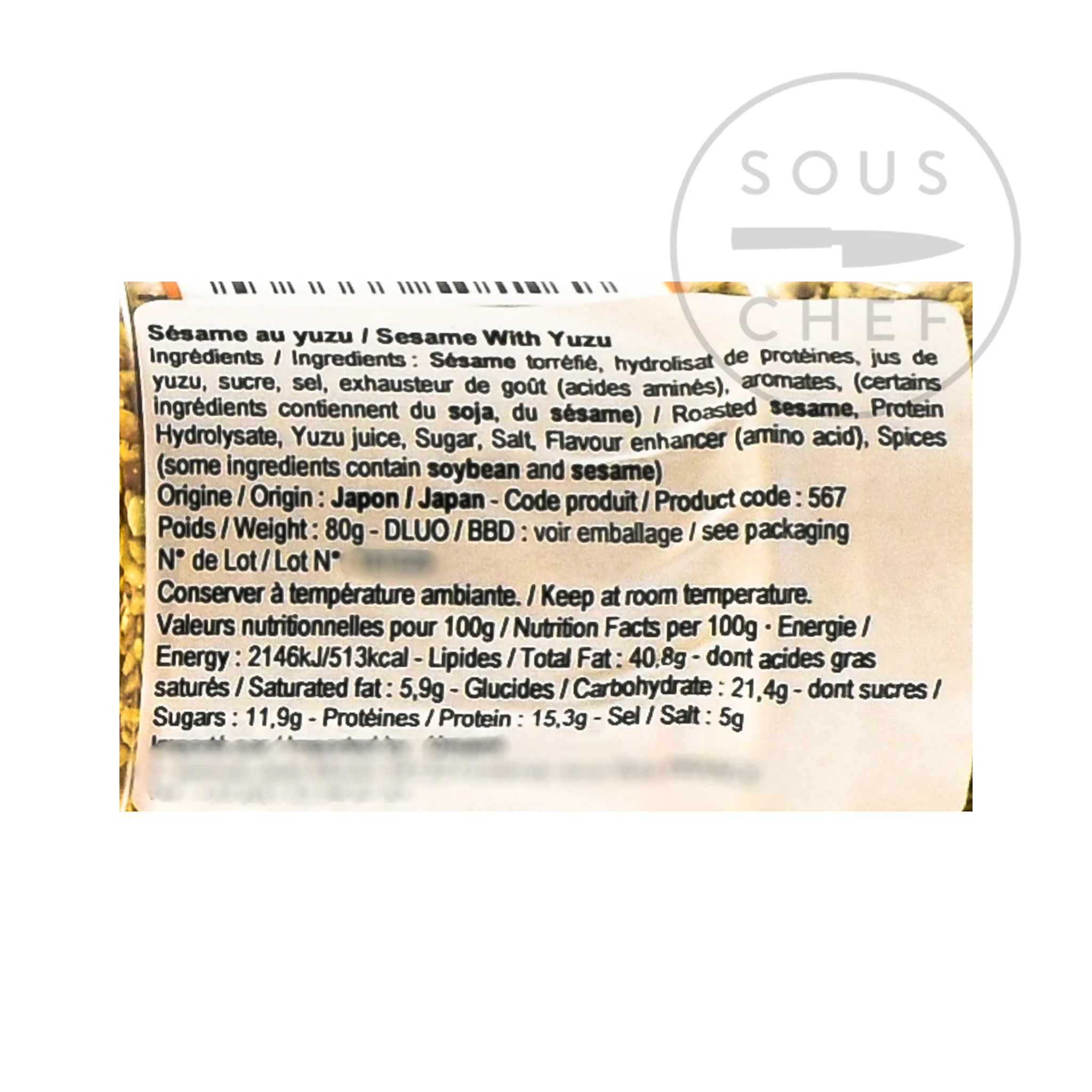 Product formulations and details may change. For the latest ingredients and allergen information always check product packaging prior to consumption. Ingredients: roasted sesame, protein hydrolysate, yuzu juice, sugar, salt, flavour enhancer (amino acid), spices. Contains allergens: sesame, soya.